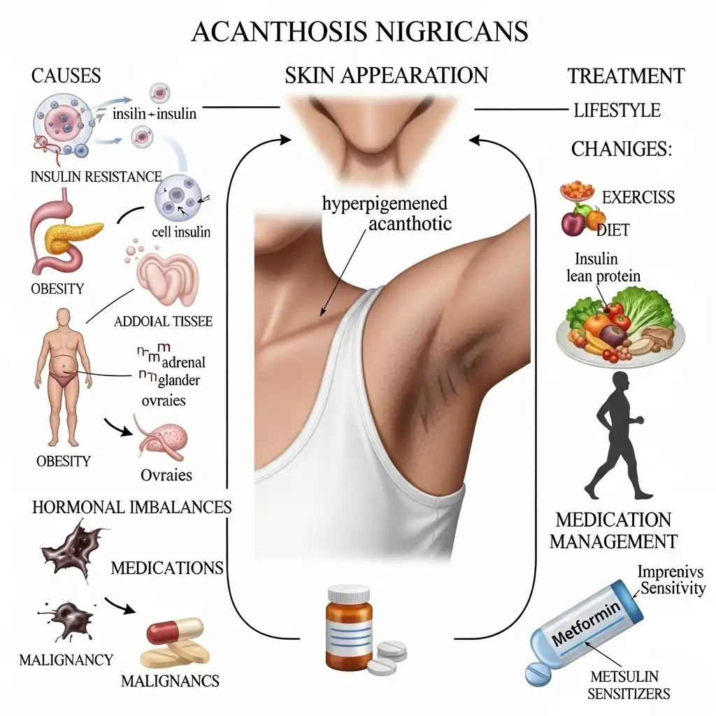 흑색가시세포증의 원인은 다양하지만, 가장 흔한 원인은 인슐린 저항성입니다. 인슐린은 혈당을 조절하는 호르몬인데, 인슐린 저항성이 생기면 인슐린이 제대로 작용하지 못하고 혈당이 높아지게 됩니다. 이로 인해 피부 세포가 과도하게 증식하면서 흑색가시세포증이 발생할 수 있습니다.